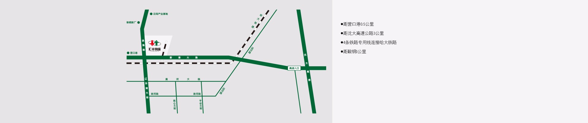 汇丰总公司位于辽宁沿海经济带的重要节点及沈阳经济圈的出海门户——营口经济技术开发区(鲅鱼圈),坐拥距营口港1号门及鲅鱼圈北站仅0.5公里的黄金地段,距沈大高速公路3公里、鞍钢新厂1公里、辽宁(营口)沿海产业基地35公里的便利条件,地理位置得天独厚,方便各种货物的集疏港运输。